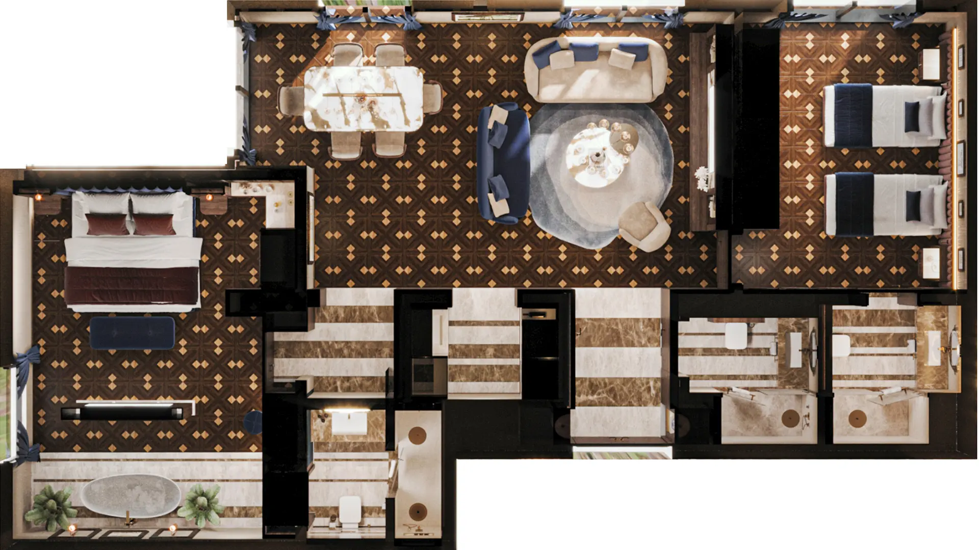 120 m² genişliğindeki iki yatak odası ve geniş salonuyla King Süit, lüks ve konforu en üst seviyede buluşturan özel bir yaşam alanı sunuyor. Maksimum 4 yetişkin + 1 çocuk kapasitesine sahip süitte; bir çift kişilik yatak, iki tek kişilik yatak, ferah bir oturma alanı, özel jakuzi ve deniz manzaralı geniş bir balkon yer alıyor. Akdeniz’in eşsiz manzarasına karşı ayrıcalıklı bir konaklama deneyimi arayanlar için tasarlandı.