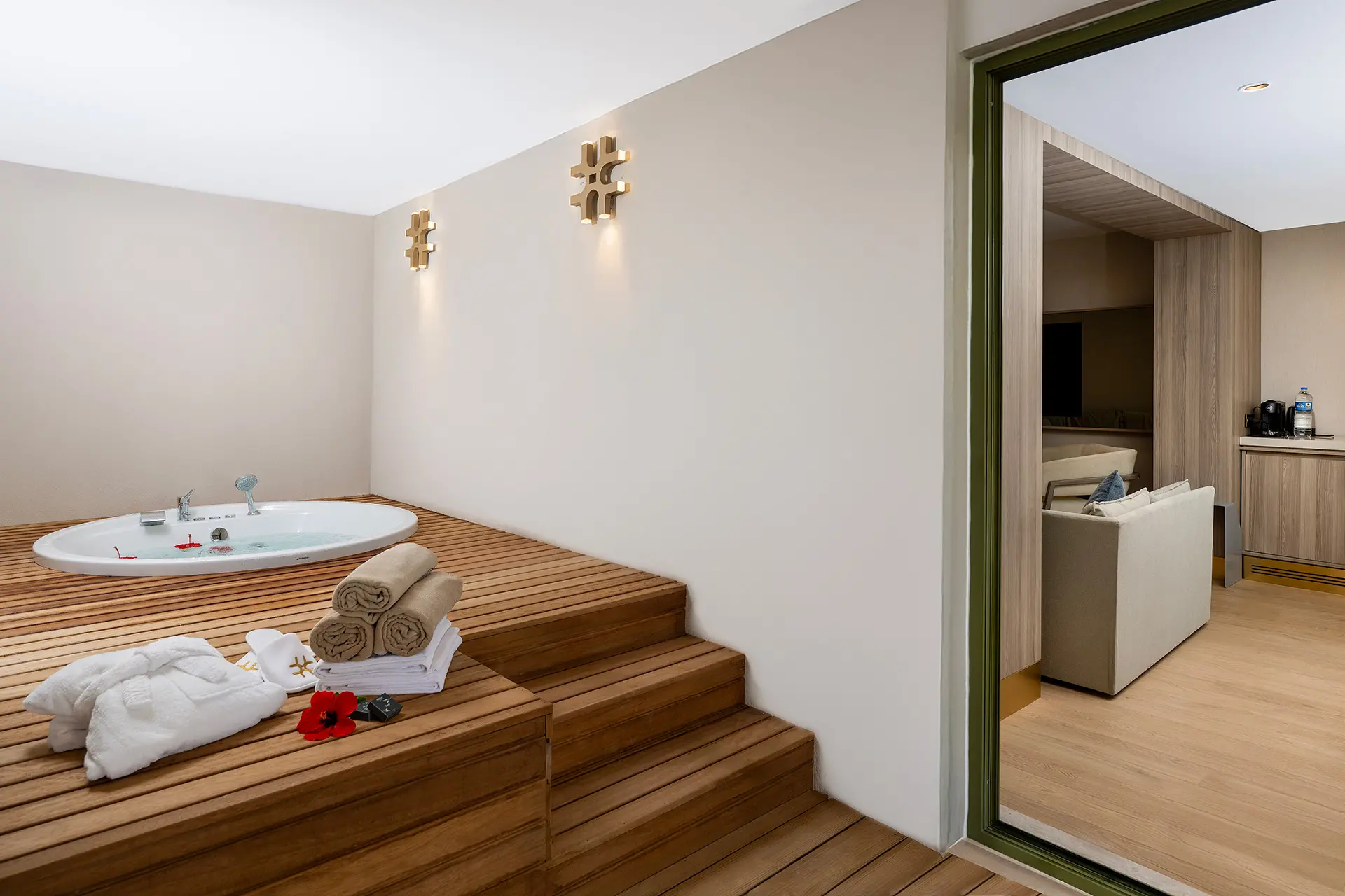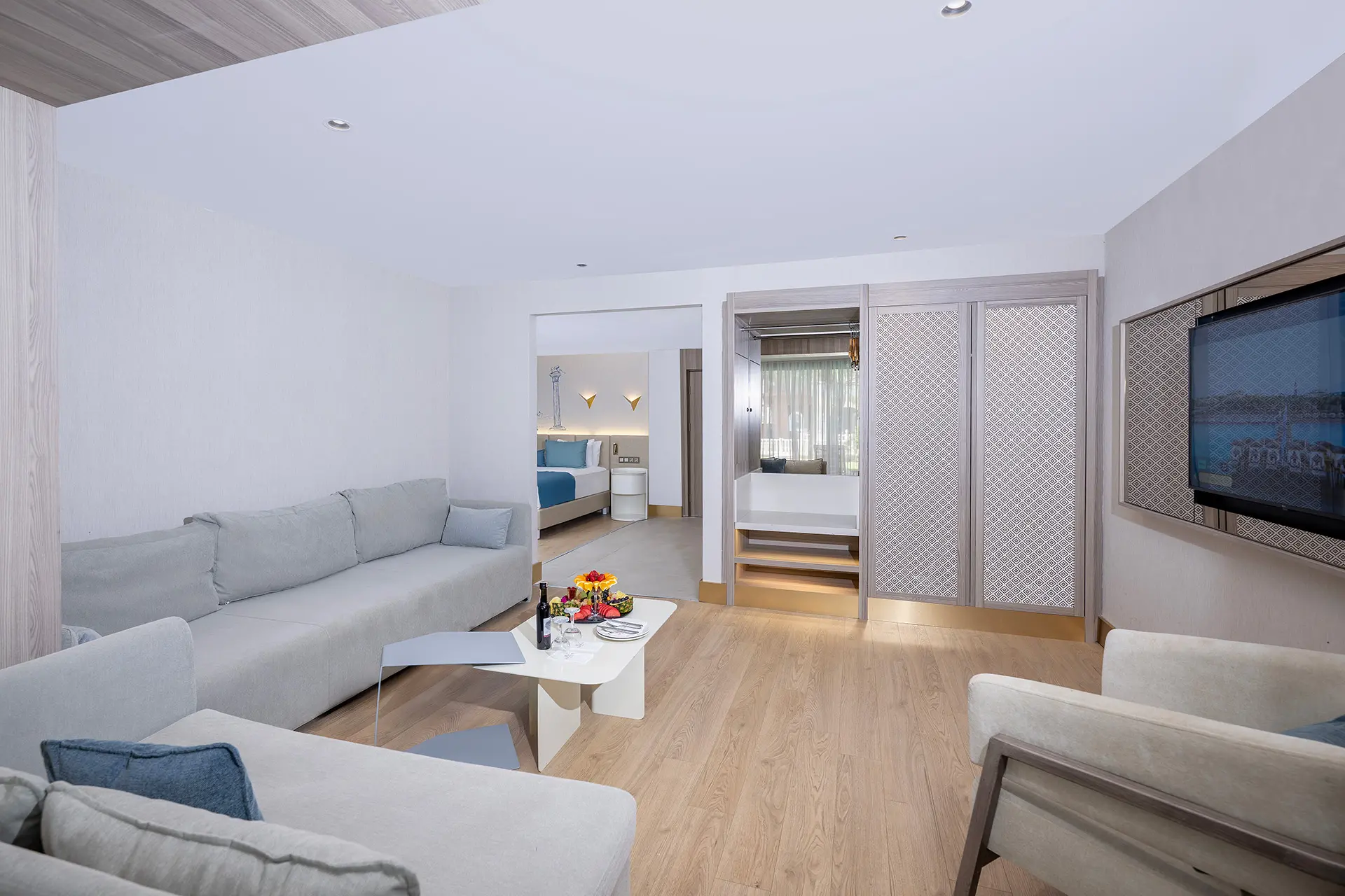 85 m² genişliğe sahip Swim Up Süit, bir yatak odası ve ayrı bir salon alanıyla ferah bir yaşam alanı sunarken, havuza doğrudan erişim sağlayan özel terasıyla benzersiz bir konaklama deneyimi yaşatıyor. Maksimum 3 yetişkin + 1 çocuk kapasitesine sahip bu özel süitte; çift kişilik yatak, iki adet sofa bed, rahat bir oturma alanı, geniş banyo ve havuz kenarında size ait özel bir dinlenme alanı bulunuyor. Günün her anında suyun serinliğini yaşamak isteyenler için eşsiz bir konfor sunuyor.